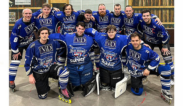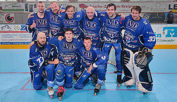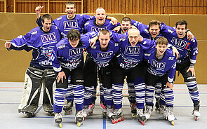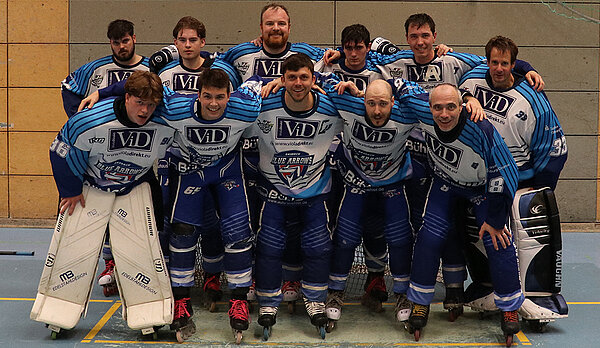 Jetzt schienen alle angekommen zu sein und gingen engagierter zur Sache. Nilo Bühler brachte die Blue Arrows mit 0:1 in Führung, doch die Hausherren ließen sich die Butter nicht vom Brot nehmen. Assenheim kam zurück und drehte das Spiel auf 2:1, doch vor der ersten Pause war das Spiel wieder ausgeglichen. Spiegelbildlich starteten die nächsten zwölf Minuten. Sasbach geht 2:3 in Führung, Assenheim dreht das Spiel auf 4:3. Robin Schell und Nilo Bühler kombinierten sich zum Ausgleich und Letzterer schoss die Blue Arrows bei noch einer Minute Restspielzeit 4:5 in Führung. Der erste Sieg gegen die Rhein Main Patriots in der Saison schien greifbar nahe. Eine kurze unkonzentrierte Phase zum Schluss brachte allerdings den Ausgleich. Mit 5:5 hieß es zum dritten Mal in dieser Saison Penaltyschießen für die Sasbacher. Den entscheidenden Treffer verwandelte Gabriel Weislogel zum 5:6 und freudestrahlend stürmten alle aufs Spielfeld.
