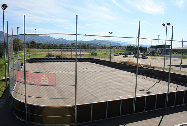 Das ist unsere Spiel- und Trainingsfläche. Die Maße sind 20x40m, Holzbanden an den Längsseiten und Rundungen nach aktuellem Regelwerk. Der 5m hohe Maschendraht-Fangzaun sorgt für einen guten Spielfluss. Für den Stilmat Evo-R Sportbelag eignen sich am besten Rollen der Härte 74A.